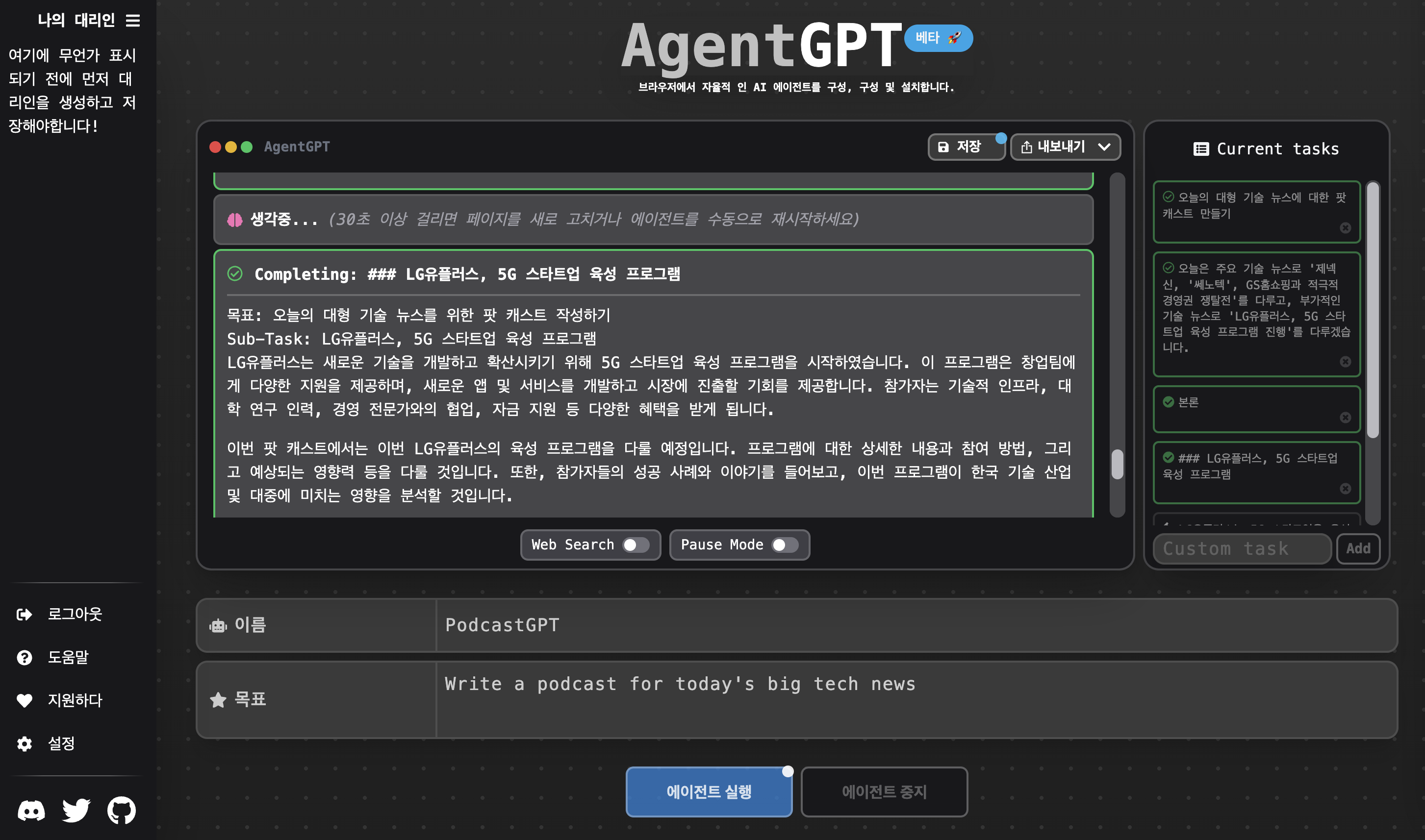 ※ 현재 AgentGPT에서는 토큰이 과다하게 소비되는 문제로, 온라인에서 정보를 가져올 수 있는 Web Search 기능을 일시적으로 제한하고 있는 상태입니다.