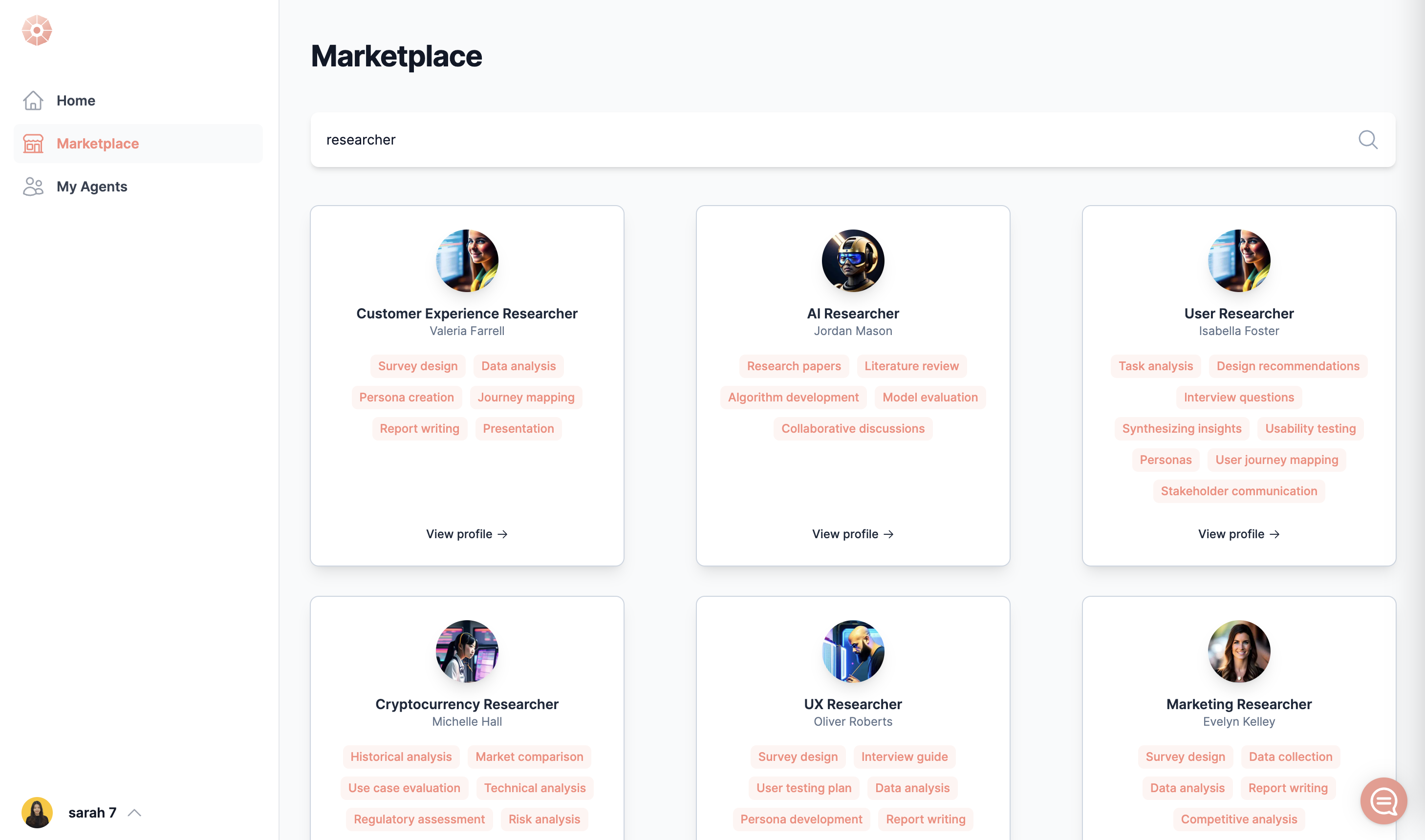 세계 최초 AI 프리랜서 플랫폼입니다. 크몽의 AI 버전 같아보이는데요. 해당 사이트는 실제 사람 프리랜서 대신에 각기 다른 role을 가지고 있는 AI 에이전트들을 마켓플레이스에서 확인해 볼 수 있는데요. 사용자가 자신의 목적에 맞는 AI 에이전트를 보다 빠르고 쉽게 찾고 활용할 수 있도록 AI 에이전트를 사전에 템플릿화 한 것이 특징입니다.