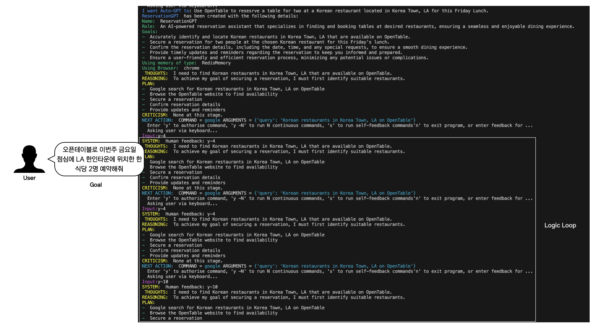 상기 이미지를 보시면 식당 예약 플랫폼 OpenTable을 메인 레퍼런스 사이트로 지정해주어도 다시 보다 광범위한 구글 브라우저 검색을 할 것을 고집하고 있는데요. 자율적으로 동일 내용의 태스크 설립, 실행 계획 수립 등을 반복하는 문제점으로 생각보다 원하는 결과물을 받기 어려웠습니다. 이는 Auto-GPT가 추론 (reasoning)을 하는 과정에 있어 다소 성능이 떨어지기 때문이라고 하는데요. 이러한 무한 루프 현상은 에이전트가 효과적으로 태스크를 처리하지 못 할 뿐 더러 필요 이상으로 토큰을 낭비하기 때문에 발견시 추가적으로 피드백을 입력하여 태스트 수행 시 필요한 툴이나 지시 사항을 구체화 해주거나 에이전트를 종료하는 것을 추천드립니다.