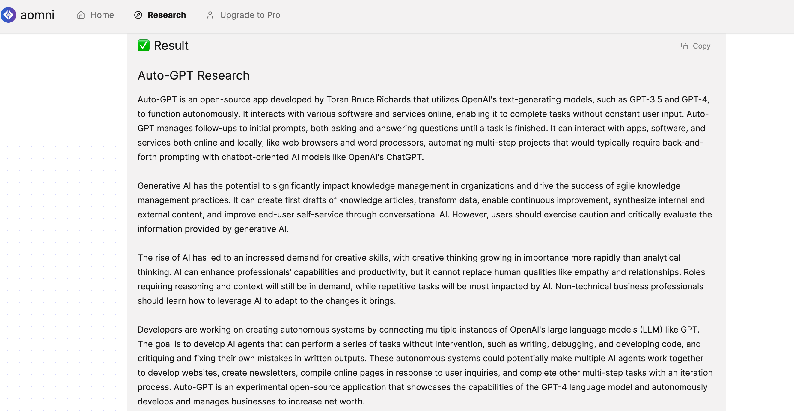 리서치에 특화된 자율 AI 에이전트로, 실시간 인터넷 브라우징을 통해 찾은 정보를 기반으로 텍스트를 생성하여 실제 사람이 리서치하는 것과 같은 프로세스와 유사하게 목표에 도달합니다. 서비스의 기본 토큰 사용량을 달성한 이후 새로운 리서치를 요청하려면 Pro 플랜으로 업그레이드가 필요합니다. 질문 하나에 토큰이 다 소비될 확률이 높다는 점 테스트 전 유의 부탁드립니다.